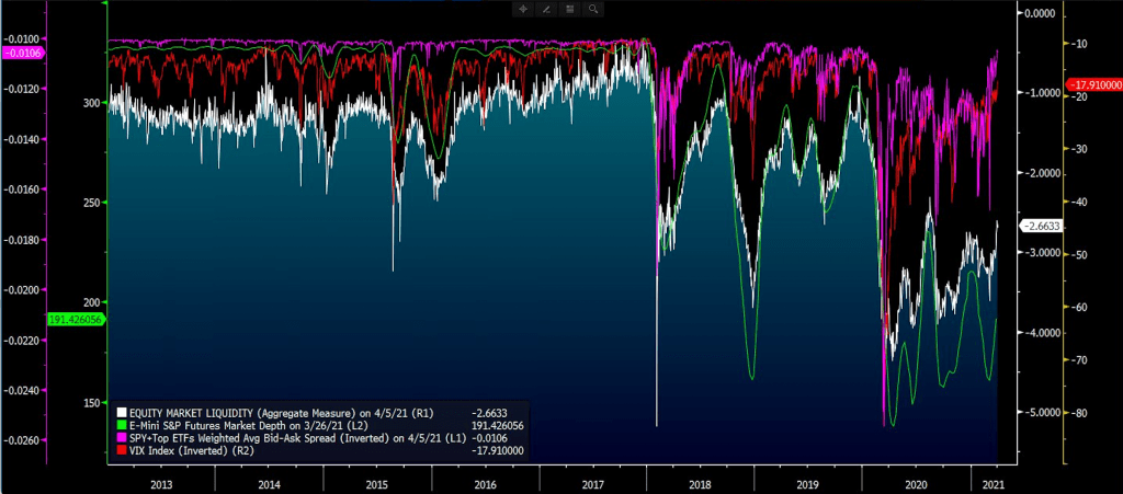 9 Stretching Spreads (@FadingRallies), “2/x) I’ve already discussed deteriorating equity market liquidity extensively, but in our overleveraged market the significance and implications of this sinister vulnerability can’t be understated. Liquidity –– most importantly market depth, has been vanishing since Volmageddon.” Twitter, April 6, 2020, https://twitter.com/FadingRallies/status/1379517912587894786/photo/1